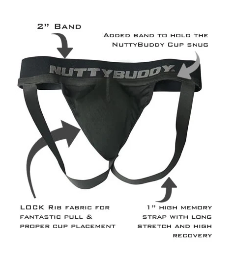 The NuttyBuddy® jock is no ordinary jock. With a 2-inch plus support band that goes around your waist, the patented gusset that stabilizes the cup (no other jock uses this thickness) and LOCK rib material, our jock is flexible but at 50% normal jock material. Why? Because you need your cup snug to the body. When you take a blow to your junk, you want the force dispersed to the pelvic bone and not to the most sensitive part of your body. Do yourself and your boys a favor, get the NuttyBuddy® Jock.